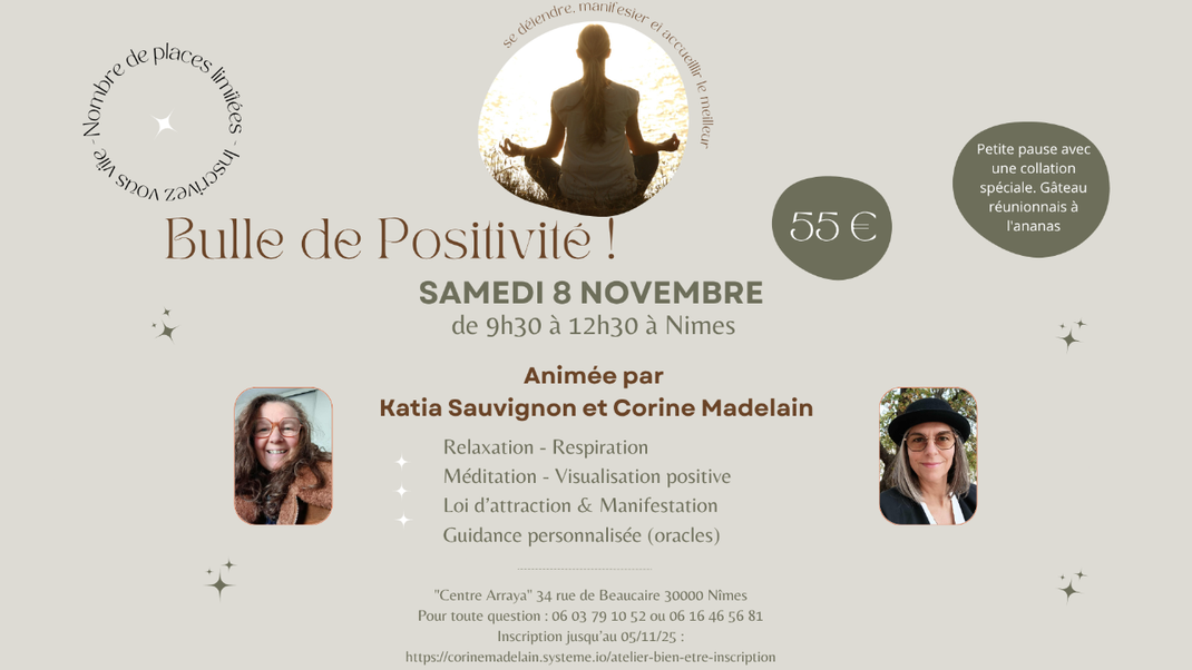 Au programme Relaxation, Respiration, Méditation, Visualisation positive, Loi d'attraction, Manifestation et Guidance personnalisée avec les oracles de Corine